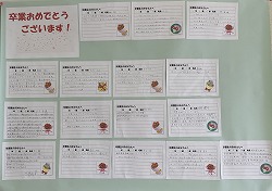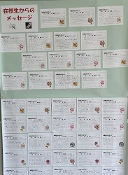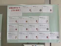 3年生の卒業まで1週間を切りました。在校生と教職員から3年生へのメッセージを記入し、1階多目的ホール壁面に掲示しています。在校生・教職員それぞれが思いをしたためています。保護者の皆様にも読んでいただきたいと思いますので卒業式まで掲示しています。