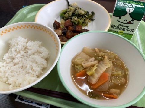 1月9日(木)、3学期2回目の給食は米飯、牛乳、ぶりのあげがらめ、のりあえ、そして「雑煮」です。餅の他に白菜、にんじん、鶏肉、油あげが入っています。