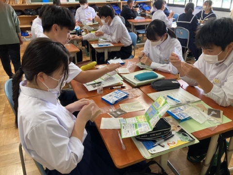 10月31日(木)、2年生理科、化学反応による熱の出入りの授業です。袋から出して振るだけで温かくなるカイロがどうして温かくなるのか、手作りしながら考えます。