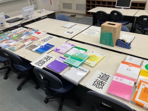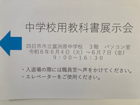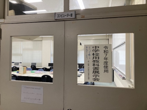 6月4日(火)から7(金)にかけて、中学校用教科書展示会を行っています。これは令和7年度から使用する中学校の教科書等について各出版社の見本を展示するものです。これらの見本の中から、実際に使用する教科書等が採択されます。どなたでも見ていただけます。