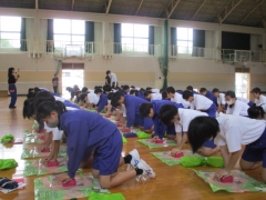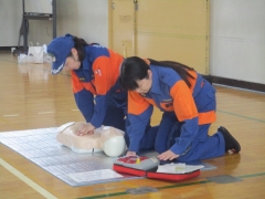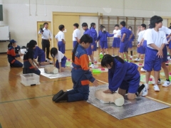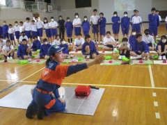 今日、1年生を対象に、四日市市北消防署とサルビア分団の方々による防災教室が行われました。5限目は北消防署の方から、防災の話をしていただき、災害時に自分たちでできることなど考える機会になりました。6限目は、サルビア分団の方から、心肺蘇生法について学び、胸骨圧迫などの実技指導をしていただきました。