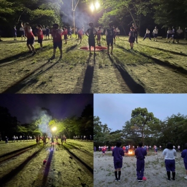 軽快な音楽に合わせて点火され、キャンプファイヤーが始まりました!皆が協力して、楽しいイベントにしようという気持ちにあふれています。皆で盛り上がっていこう!