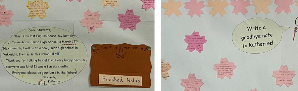 YEFキャサリンさんの本校での勤務が最終日となりました。英語の授業だけでなく、職員室前のボードも彩り、生徒たちを楽しませてくれました。