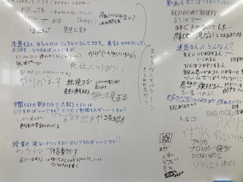 下の写真はほっとルームのホワイトボードです。生徒の書き込みがあります。