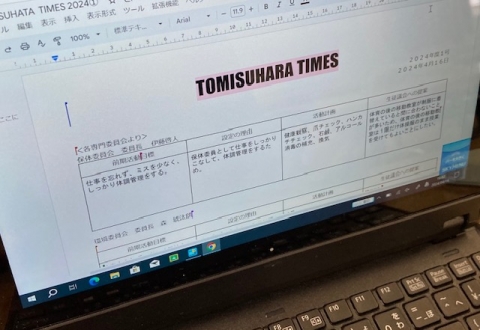 各専門委員会、各学年からの提案等はタブレットの画面で共有しています。この画面、参加者全員で同時に編集可能です。保体委員会から「体育の後の移動教室が制服に着替えていると間に合わない」ため、直後の授業を体操服のまま受けることについて提案しています。
