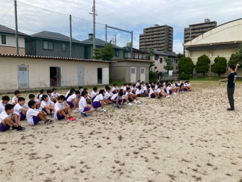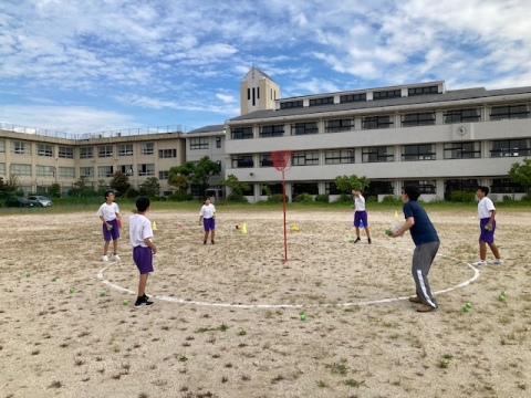 9月19日(木)2限目、薄曇りですが蒸し暑さを感じる運動場で、1年生が体育祭の生徒会種目の練習を行っていました。