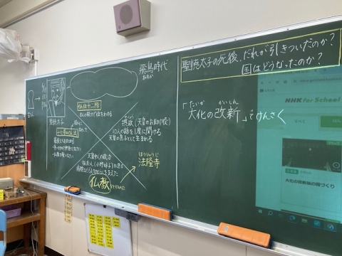 6年生の社会科の授業の黒板です。この教室では机をコの字型に配置し、お互いの顔を見合えるよう工夫していて、面白いと思いました。