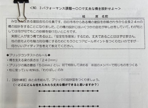 前回のプリント<〇〇で丈夫な橋を設計せよ>「みなさんはある建設会社の社員です。四日市市からある橋の建設を依頼され、、、」