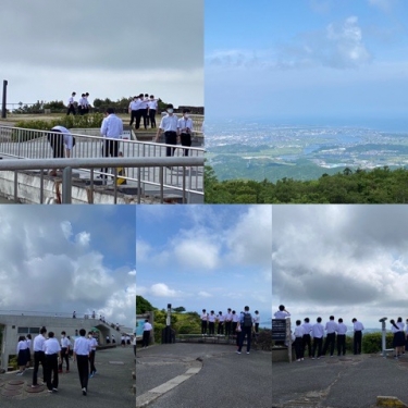 朝熊山展望台に来ました。天気も良く、伊勢湾がきれいに見えます。気温が3℃ほど下がっているようで、風が吹いて快適です。皆が絶景をバックに記念撮影をしています。