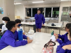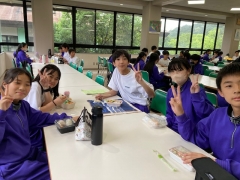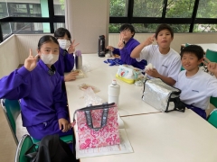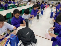 自然教室の昼食は各自が持参のお弁当です。おうちの人に朝早くから準備をしていただいたお弁当を、子どもたちは美味しそうに食べています。