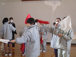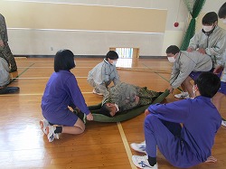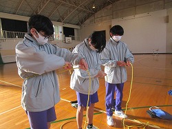 12月19日、2年生を対象に自衛隊の方にきていただき、防災・職業講話をしていただきました。実技演習として、「手旗」「ロープワーク」「応急担架」などを教えていただきました。災害への備えとして、一つでも自分たちでできることを増やすきっかけとなったと思います。