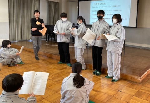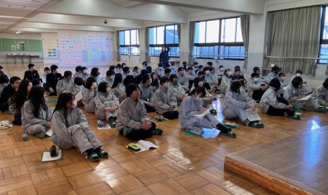 1月28日(火)6限目、2年生が明日の名古屋分散学習に向けて最終の事前学習(出発式)を行いました。名古屋分散の目的は【キャリア教育】【平和と人権】【公共心・道徳心】の3つ。生徒が決めたスローガンは "Peace Tomisuhara" です。