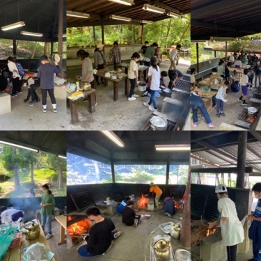 キャンプ飯を作るために、まずは火を起こさなければいけません。マキを運び、新聞紙を入れて、着火!うちわであおぐとかなりけむたいですが、皆で交代しながら頑張りました。見事、火がつき、お湯を沸かします!