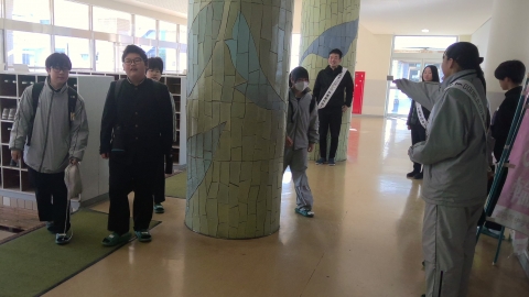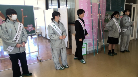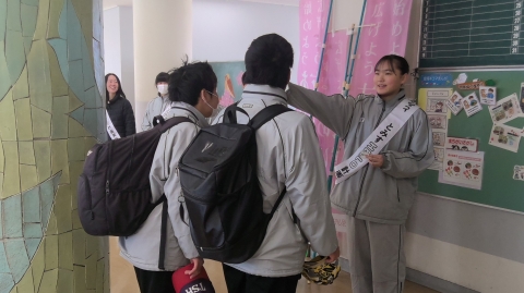 Vào buổi sáng trời quang đãng thứ Năm, ngày 12 tháng 3, các thành viên ban chấp hành hội học sinh đang thực hiện hoạt động chào hỏi buổi sáng. Những dải băng đeo vai của các em là mới.