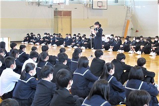。また、生徒会役員のみなさんから、富洲原中学校での生活のことや行事、校則等について説明がありました。覚えることがたくさんありますが、1年生のみなさんは