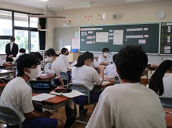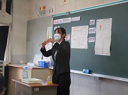 実習生とともに保健の授業を行いました。カプセルを少量の水で飲むとどうなるか、錠剤をオレンジジュースで飲むとどうなるかなど、実験をしながら、正しい飲み方について考えました。