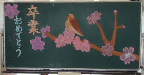 3月2日(月)朝、生徒昇降口にある美術部の黒板アートも変わりました。3年生にとって今週は、中学校生活最後の週となります。