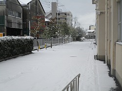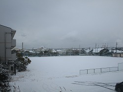 先週から寒波が来るといわれていましたが、昨夜から降り積もった雪で一面真っ白になりました。今日は市内臨時休校ということで、静かなグランドです。