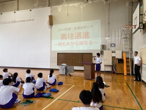 最後に、生徒会から生徒会テーマ「勇往邁進 ~猿も木から落ちる~」の発表、説明がありました。これは体育祭(10/8火予定)のスローガンになります。