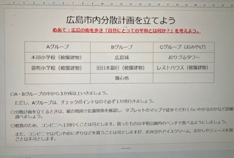 Vào chiều thứ Tư, ngày 16 tháng 4, các học sinh năm thứ ba đã lập kế hoạch hoạt động theo nhóm tại thành phố Hiroshima. Trong chuyến đi học, các em sẽ đi bộ quanh thành phố Hiroshima và suy ngẫm về câu hỏi: “Hòa bình có ý nghĩa gì đối với tôi?”