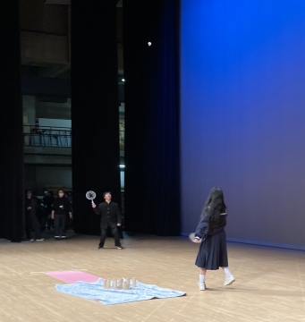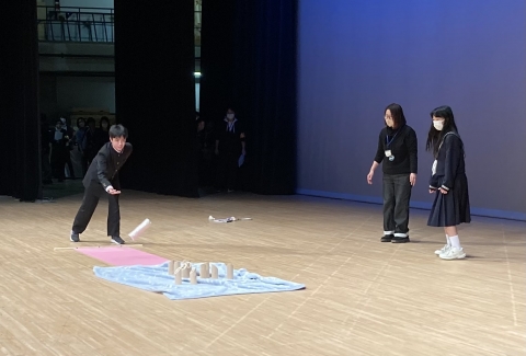 「クラスで行っていること」ということで、普段のE組の学習として行っているバドミントンとモルックを紹介しました。
