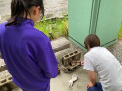 午前はオリエンテーリングの予定でしたが、雨のため焼杉のコースターづくりに変更しました。まず、板を選び、デザインを考え、のこぎりで形を整えます。のこぎりは直線しか切ることができず、しかも切るのに結構時間がかかります。途中でデザインを変更するなど、みんな臨機応変に対応していました。切れた板は外でバーナーで焼いて、川でススを洗い落とし、マーカーで仕上げます。