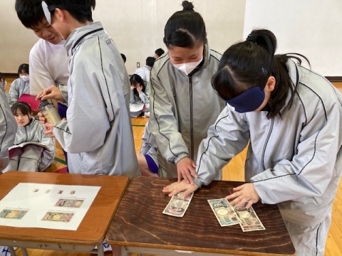 手で触ってお札を区別しています。この後、ペアでガイドの体験もします。