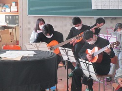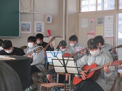 3年生の音楽の授業では、ギター演奏をしていました。ギターだけだと何の曲かわからなくても、先生の弾くピアノと合わせると、素敵なメロディが流れました。少しのコードを覚えるだけでもギターが弾けるようになり、とても楽しそうでした。