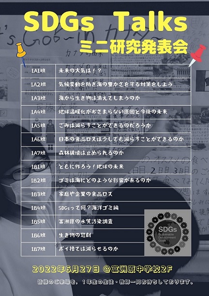 27日(月)の授業公開ですが、学年通信等でも配信させていただいたように、1年生は「SDGs Talks ミニ研究発表会」を行います。自然教室での説明会で学年議会のメンバーが説明していたように、1学期の総合的な学習の時間の総まとめ&2学期に向けての土台づくりの様子を参観していただきます。当日は、保護者の方々にも「評価」をしていただくことを企画しております。お子様の成長が手に取るように分かる機会になるかと思いますので、奮ってご参加ください。よろしくお願いします。