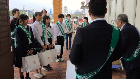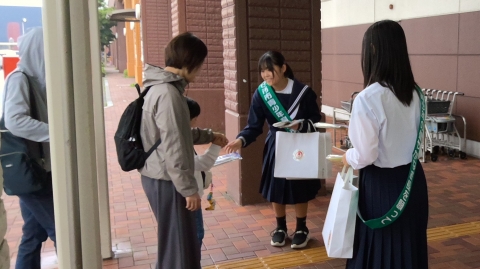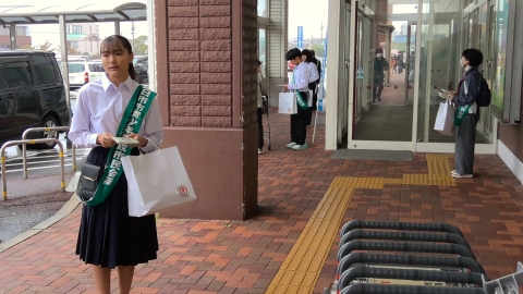अक्टोबर २६ (आइतबार) बिहान १०:०० देखि ११:०० सम्म, टोमिसुहारा माध्यमिक विद्यालयका विद्यार्थी परिषदका सदस्यहरूले Aeon Yokkaichi Kita मा आयोजित सडक सचेतना कार्यक्रममा सहभागी भइरहेका छन्।