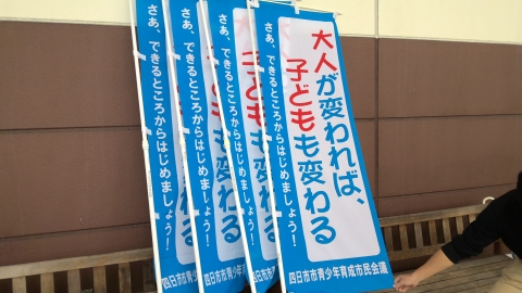懸垂幕「大人が変われば子どもも変わる」は、1か月間掲示されます。