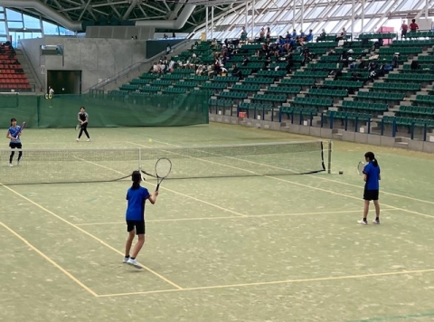 テニス女子団体戦。ダブルス。富洲原中は手前側です。