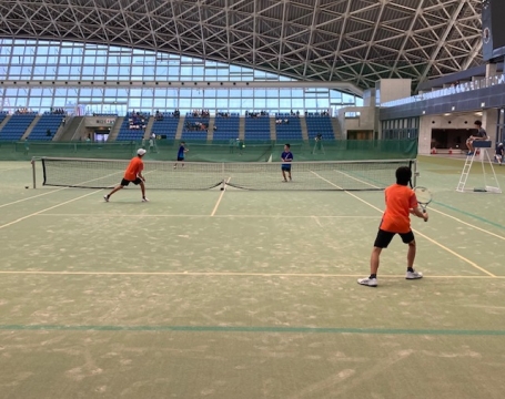 テニス男子団体戦。ダブルス。対戦相手は笹川中。富洲原中は手前側です。