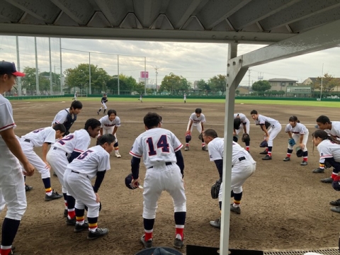 軟式野球。羽津中との合同チームです。1回表の守備を終えて集合しています。