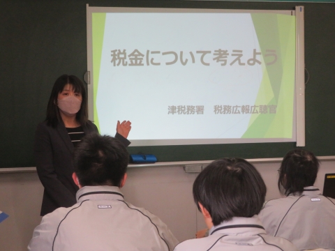 1月17日(金)、津税務署の税務広報公聴官の方にお越しいただき、3年生が税金について考える「租税教室」を行いました。