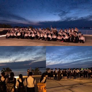 夕食後は、中庭へ出て星空観察会です。残念ながら曇り空で星は見えませんが、星野先生から月の話をしてもらいました。下弦の月など、月の話を聞き、何とも幻想的な夜になりました。その後、夜空の下で記念撮影をしました。きっと皆の一生の思い出になるでしょう。