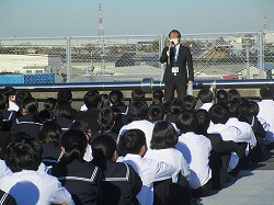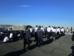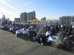 今回は紀伊半島沖に地震が発生し、その後、津波警報が発令されたという設定です。第1次避難はグランドに3分半ほどで集合しました。その後の屋上への避難は全生徒が避難をするのに6分ほどかかりました。毎年練習を重ねますが、実際に警報が発令された時も慌てずに避難できるようにしたいと思います。