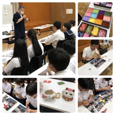 今日は伝統的工芸品の木目込人形の体験として、木目込鞠を作っています。