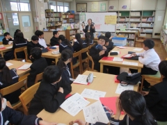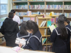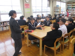1年生の生徒たちが、司書さんから、図書室の使い方や図書室の本の分類などの説明を聞きました。説明後、生徒たちは自分の気になる本を手に取ったり、さっそく借りたりしていました。小学校の図書室とは違う本の品ぞろえに、生徒たちは目を輝かせていました。今後、図書室を利用し、たくさんの本に出会い、見識を深めたり、共感力や想像力を高めたりしていきましょう。