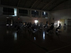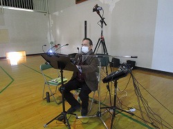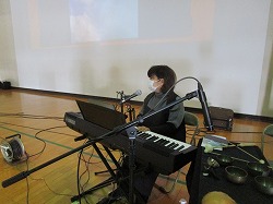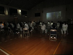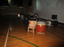 体育館を真っ暗にして、壁面に絵本を写しだし、音楽の生演奏に合わせて読みきかせをしていただきました。楽器はピアノ・尺八・和太鼓などたくさんの種類を用意していただき、各絵本に合わせて奏でていただき、本当によい時間が流れました。