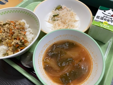 1月27日(月)の給食はガパオライス、トムヤムスープ、タイ風春雨サラダ、牛乳です。