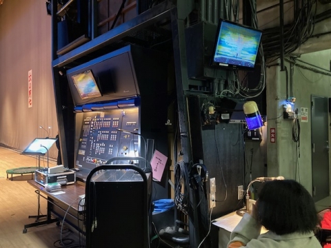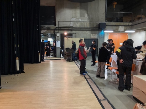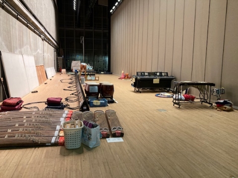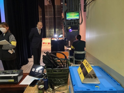 舞台裏には各校の準備物が発表の順番に置かれています。午前の部では27校のステージ発表があります。