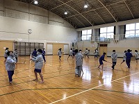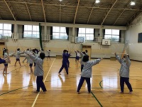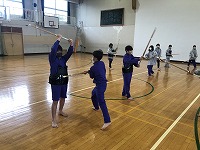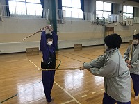 礼儀作法や歴史、竹刀の名称などから始まり、素振りや2人組での打ち込みなどを行っていました。竹刀を持つことが初めての生徒も多い中、すり足に苦戦する姿や力いっぱい面打ちをする姿を見ることができました。