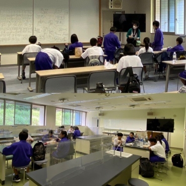 環境学習が終わり、昼食の時間になりました。環境学習センターの研修室と実習室をお借りして、お弁当を食べます。密を避けるため、昼食の班と展示見学の班に分け、交代制としています。