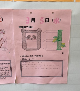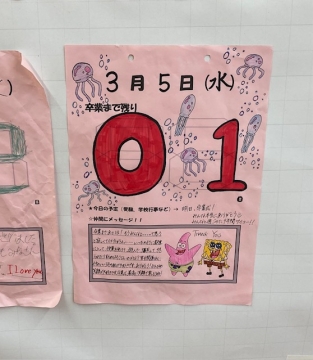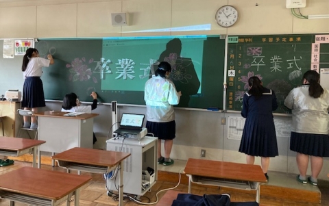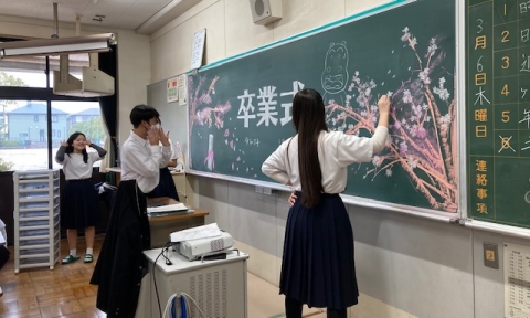 3年生はすでに放課となっていますが、教室では有志が黒板アートを作成しています。