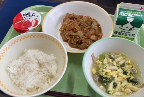 3月18日(火)の給食は米飯、牛乳、ホイコーロウ、中華風たまごスープ。いちごゼリーが付いています。