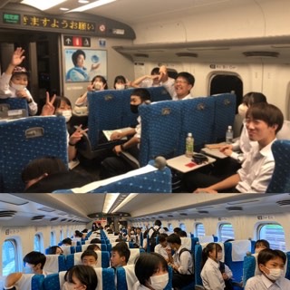 新幹線ではお菓子を食べながら友達と楽しく過ごしています。