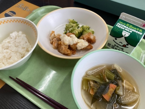 2月13日(木)の給食は、米飯、牛乳、チキン南蛮、ゆでブロッコリー、すまし汁です。