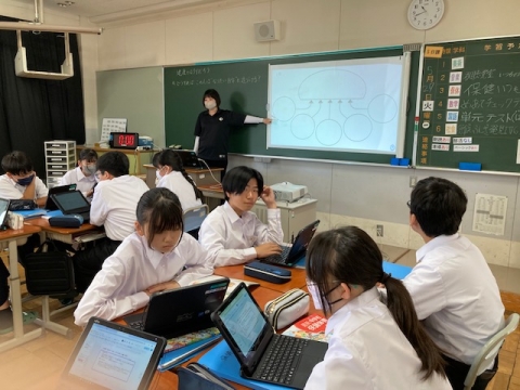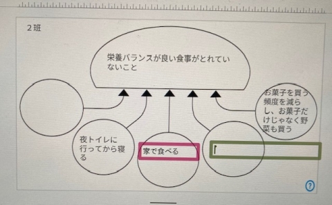 5月27日(火)、1年生の保健体育(保健分野)の授業を参観しました。単元は「健康な生活と病気の予防」です。各班に与えられた事例について、健康上の課題を読み取り、解決策を考えます。今回も思考ツール、クラゲチャートが登場します。