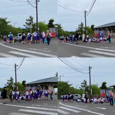 少年自然の家に向けて、ハイキングをしています。約2キロメートルの道のりですが、各クラス一列で歩きます。